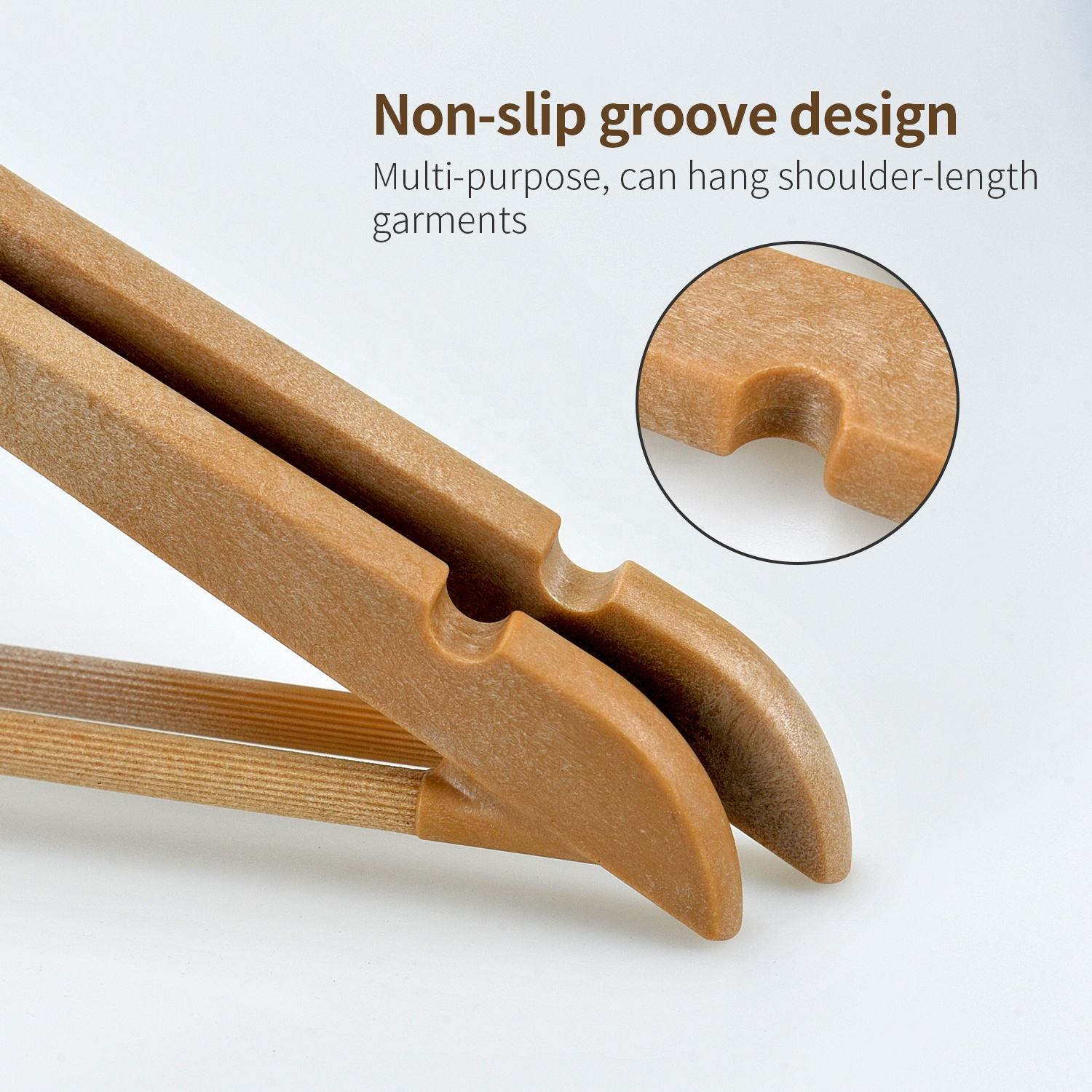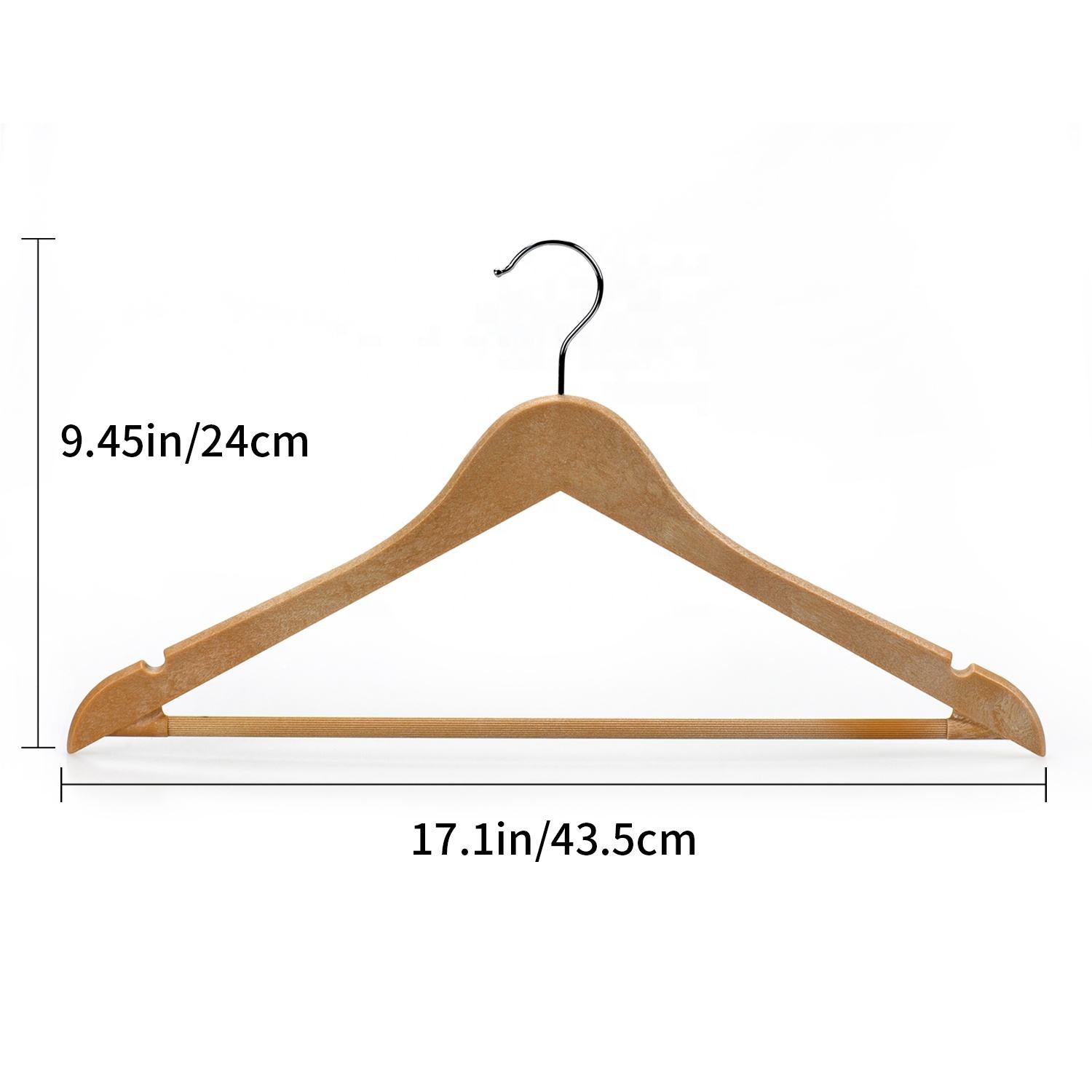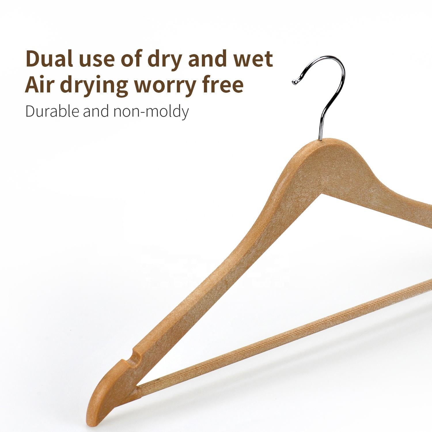 This kind of Wooden-like Plastic Suit Hangers is powerful with its natural strong PP materials and wood like structure, which arrows them to hold heavy clothing and without worrying about falling down in the windy days.